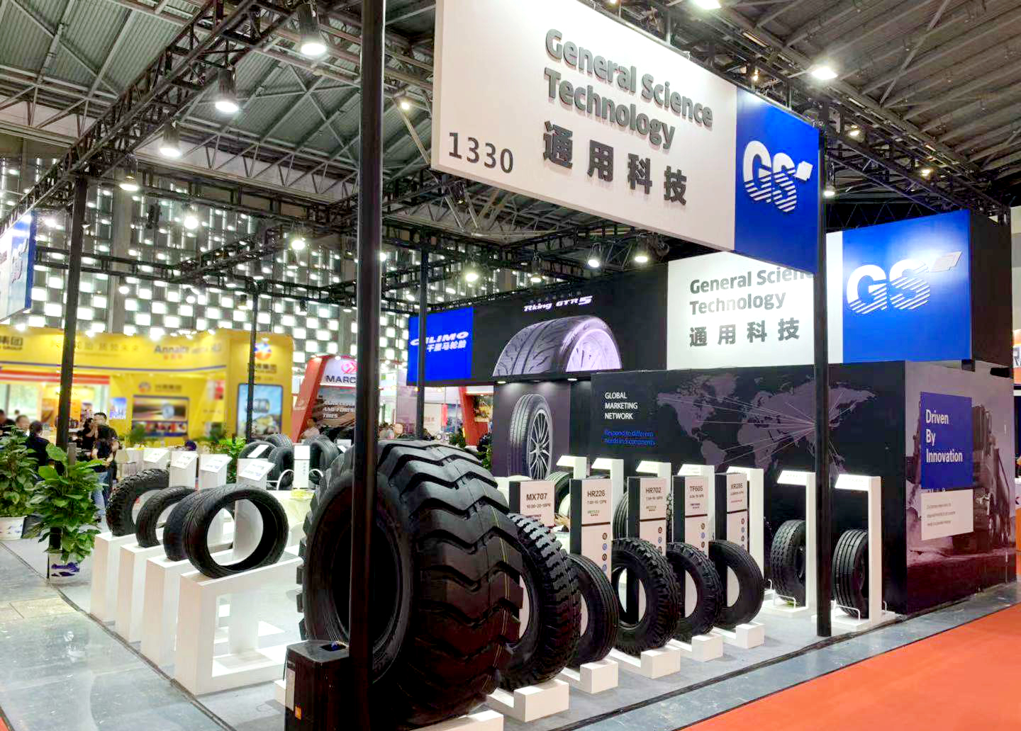 本次展會,通用股份展臺設(shè)計以標志性品牌顏色——藍色為主題調(diào),展廳整體色系統(tǒng)一、層次鮮明,凸顯了通用股份科技、創(chuàng)新、未來的產(chǎn)品設(shè)計理念,向用戶展示了通用始終以提升創(chuàng)新能力為核心,大力推進智能制造,打造世界一流民族輪胎品牌的發(fā)展愿景。